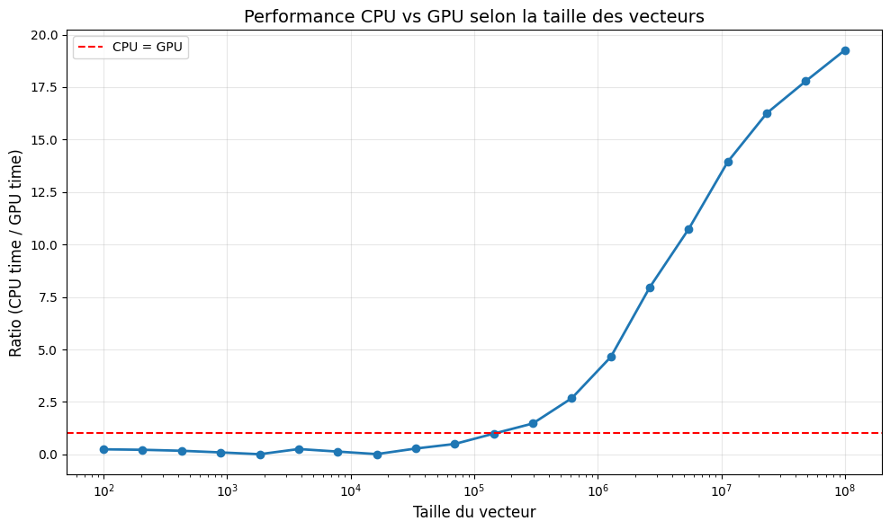 - L’overhead mémoire compte : pour les petites données, le temps de transfert CPU→GPU peut annuler l’avantage du parallélisme